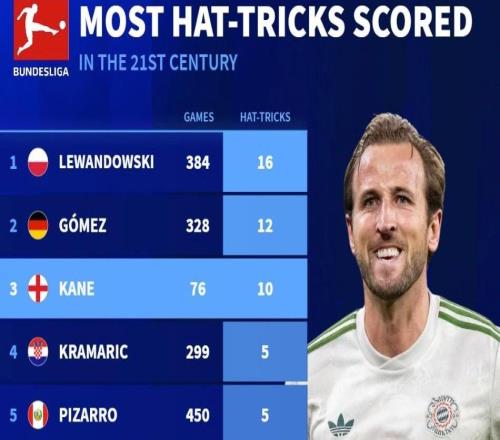 本世纪德甲戴帽数前10:莱万384场16次第1,凯恩76场10次第3