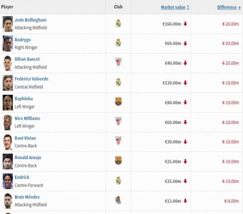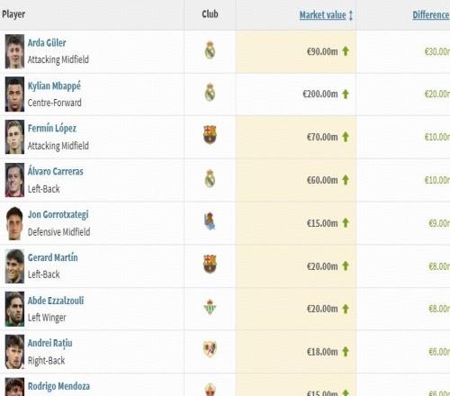 德转西甲身价涨幅榜:居莱尔上涨3000万欧,姆巴佩上涨2000万欧